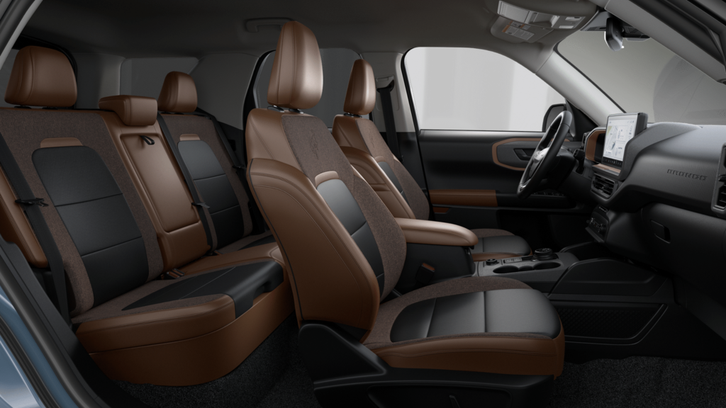 Bronco Sport Outer Banks is nicely equipped with Equipment Group 300A Standard Package, Ford Connectivity Package (1-Year Included), Internet access capable: 5G Modem - Ford Connectivity Package, Outer Banks Tech Package+ (Connected Navigation (1-Year Included) and Radio: HD w/B&O Sound System by Bang & Olufsen), 360-Degree Camera w/Trail View, 4-Wheel Disc Brakes, 6 Speakers, ABS brakes, Air Conditioning, Alloy wheels, AM/FM radio: SiriusXM with 360L, AM/FM Stereo, Apple CarPlay/Android Auto, Auto High-beam Headlights, Auto-dimming Rear-View mirror, Automatic temperature control, Brake assist, Compass, Delay-off headlights, Driver door bin, Driver vanity mirror, Dual front impact airbags, Dual front side impact airbags, Electronic Stability Control, Emergency communication system: SYNC 4 911 Assist, Exterior Parking Camera Rear, Four wheel independent suspension, Front anti-roll bar, Front Bucket Seats, Front Center Armrest, Front Driver/Passenger Seat Back Map Pockets, Front dual zone A/C, Front fog lights, Front Parking Sensors, Front reading lights, Fully automatic headlights, Heated door mirrors, Heated front seats, Heated steering wheel, Illuminated entry, Knee airbag, Low tire pressure warning, Memory seat, Occupant sensing airbag, Outside temperature display, Overhead airbag, Overhead console, Panic alarm, Passenger door bin, Passenger vanity mirror, Power door mirrors, Power driver seat, Power passenger seat, Power steering, Power windows, Premium Trimmed Htd Fr Sport Contour Bucket Seats, Radio data system, Rear anti-roll bar, Rear Parking Sensors, Rear reading lights, Rear seat center armrest, Rear window defroster, Rear window wiper, Remote keyless entry, Reverse Brake Assist, Security system, SiriusXM w/360L, Speed control, Speed-sensing steering, Speed-Sensitive Wipers, Split folding rear seat, Steering wheel mounted audio controls, SYNC 4 w/Enhanced Voice Recognition, Tachometer, Telescoping steering wheel, Tilt steering wheel, Traction control, Trip computer, Variably intermittent wipers, and Wheels: 18" Ebony Black-Painted Aluminum.
