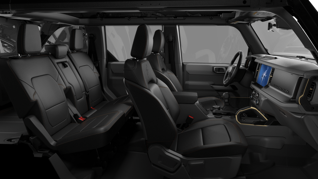 Bronco Badlands is nicely equipped with Equipment Group 334A Lux Package (2-Door Intelligent Access with Lock/Unlock, 360-Degree Camera, Adaptive Cruise Control, Ambient Footwell Lighting, Connected Navigation, Driver and Front Passenger Illuminated Sliding Visor Vanity Mirrors, Dual Smart Charging USB Ports, Dual-Zone Electronic Automatic Temperature Control, Evasive Steering Assist, Front Parking Sensors, Front Row Heated Seats, Heated Steering Wheel, Information on Demand Panel, Marine Grade Vinyl Heated Bucket Seats, Pro Power Onboard - 400W, Rear Parking Sensors, Sideview Mirrors, and Wheels: 17" Carbonized Gray-Painted Aluminum), Ford Connectivity Package (1-Year Included), Sasquatch Package (Front Stabilizer Disconnect, High Clearance Suspension, Position-Sensitive Bilstein Shock Absorbers, and Wheels: 17" Matte Black Alloy), 4-Wheel Disc Brakes, 7 Speakers, ABS brakes, Air Conditioning, Alloy wheels, AM/FM radio: SiriusXM with 360L, AM/FM Stereo, Auto High-Beam Headlamps, Auto High-beam Headlights, Auto-dimming Rear-View mirror, BLIS Blind Spot Information System, Brake assist, Carbonized Gray Molded-in-Color Hard Top, Compass, Delay-off headlights, Driver door bin, Driver vanity mirror, Dual front impact airbags, Dual front side impact airbags, Electronic Stability Control, Emergency communication system: 911 Assist, Exterior Parking Camera Rear, Front anti-roll bar, Front Bucket Seats, Front Center Armrest, Front fog lights, Front reading lights, Front Row Top Panels and Door Storage Bags, Front wheel independent suspension, Fully automatic headlights, Hard Top Sound Deadening Headliner, Heated door mirrors, Heated front seats, Illuminated entry, Integrated roll-over protection, Internet access capable: FordPass Connect, Lane-Keeping System, Leather Shift Knob, Leather-Trimmed/Vinyl Bucket Seats, Low tire pressure warning, Occupant sensing airbag, Outside temperature display, Overhead airbag, Overhead console, Panic alarm, Passenger door bin, Passenger vanity mirror, Power door mirrors, Power steering, Power windows, Pre-Collision Assist with Automatic Emergency Braking, Radio data system, Rear-View Camera, Rear-Window Defroster and Washer, Remote keyless entry, Security system, SiriusXM with 360L, Speed control, Split folding rear seat, Steering wheel mounted audio controls, SYNC 4, Tachometer, Telescoping steering wheel, Tilt steering wheel, Traction control, Trip computer, Upgraded Carpet Floor Mats, Variably intermittent wipers, and Voltmeter.