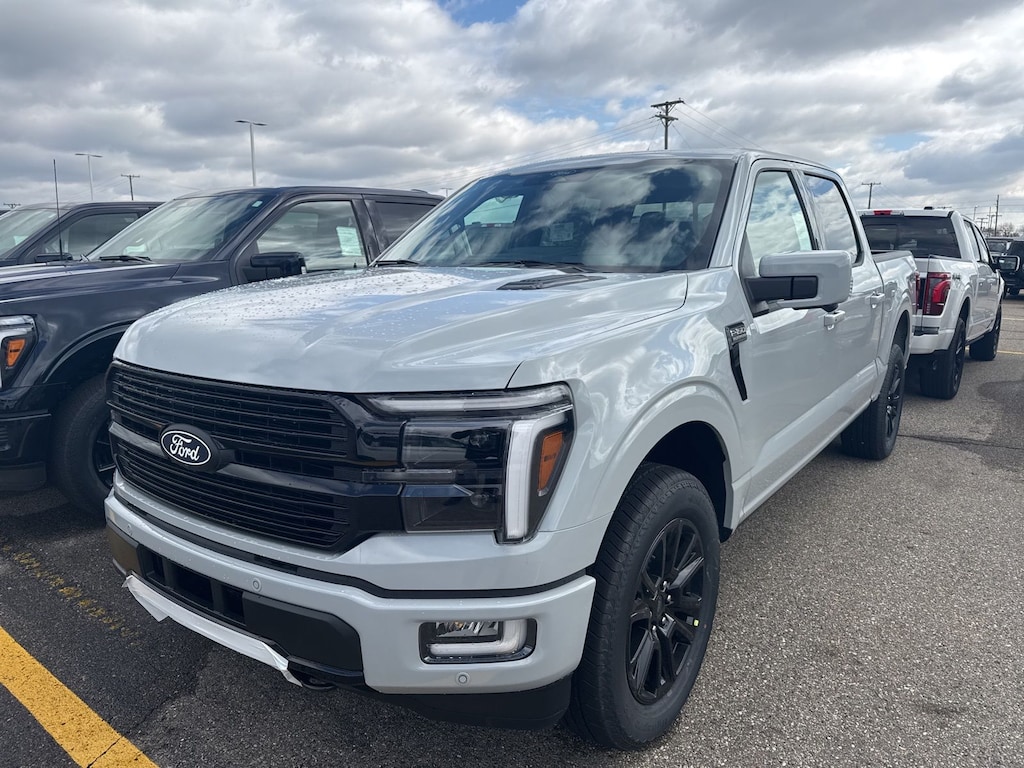 F-150 Platinum is nicely equipped with Equipment Group 702A High (Electronic Locking with 3.55 Axle Ratio, Power-Deployable Running Boards, Radio: B&O Unleashed Sound System by Bang & Olufsen, Unique Multi-Contour Leather Bucket Seats, and Wheels: 20" Painted Gloss Ebony Black), Ford Connectivity Package (1-Year Included), GVWR: 7,400 lbs Payload Package, Internet access capable: 5G Modem - Ford Connectivity Package, 4WD, 4-Wheel Disc Brakes, 8 Speakers, ABS brakes, Adjustable pedals, Air Conditioning, Alloy wheels, AM/FM radio: SiriusXM with 360L, Auto High-beam Headlights, Auto tilt-away steering wheel, Auto-dimming door mirrors, Auto-dimming Rear-View mirror, Automatic temperature control, Brake assist, Bumpers: body-color, Compass, Delay-off headlights, Driver door bin, Driver vanity mirror, Driver's Side SecuriCode Keyless-Entry Keypad, Dual front impact airbags, Dual front side impact airbags, Electronic Stability Control, Emergency communication system: SYNC 4 911 Assist, Front anti-roll bar, Front Bucket Seats, Front Center Armrest, Front dual zone A/C, Front fog lights, Front reading lights, Front wheel independent suspension, Fully automatic headlights, Garage door transmitter, Heated door mirrors, Heated front seats, Heated rear seats, Heated steering wheel, Illuminated entry, Leather steering wheel, Low tire pressure warning, Memory seat, Navigation system: Connected Navigation, Occupant sensing airbag, Outside temperature display, Overhead airbag, Overhead console, Panic alarm, Passenger door bin, Passenger vanity mirror, Pedal memory, Power door mirrors, Power driver seat, Power passenger seat, Power steering, Power windows, Radio data system, Radio: B&O Sound System by Bang and Olufsen, Rain sensing wipers, Rear reading lights, Rear seat center armrest, Rear step bumper, Rear window defroster, Remote keyless entry, Security system, Speed control, Split folding rear seat, Steering wheel memory, Steering wheel mounted audio controls, SYNC 4 with Enhanced Voice Recognition, Tachometer, Telescoping steering wheel, Tilt steering wheel, Traction control, Trip computer, Turn signal indicator mirrors, Twin Panel Moonroof, Variably intermittent wipers, and Ventilated front seats.