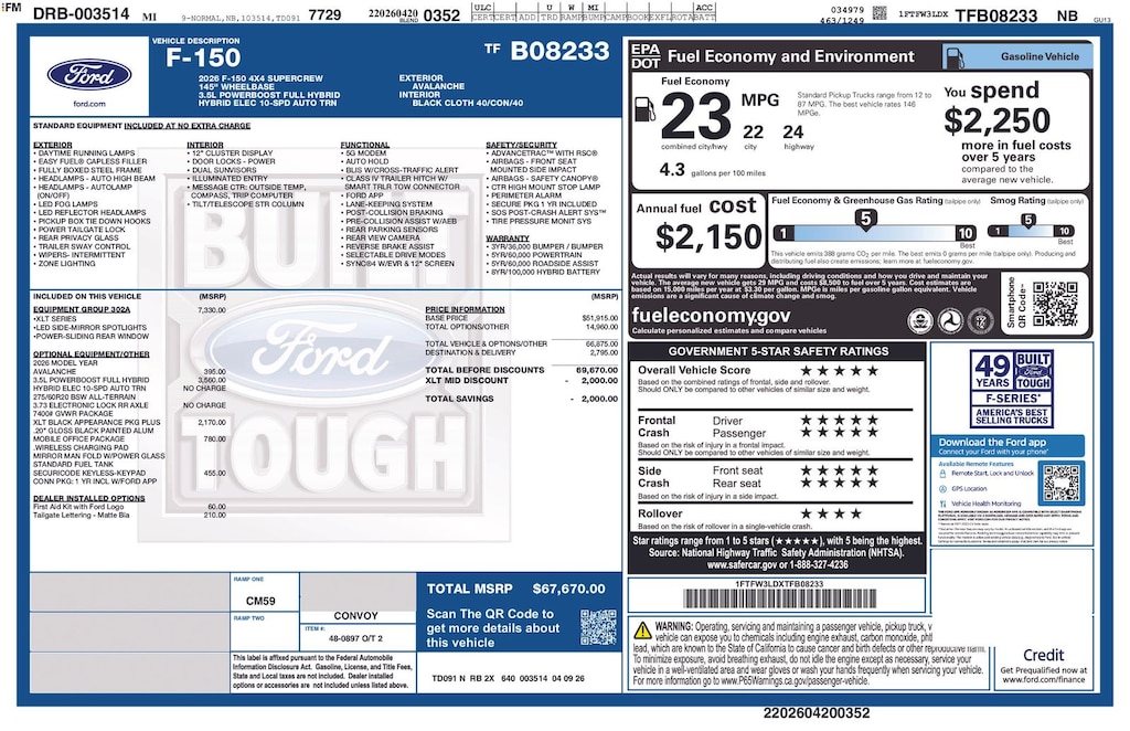 Recent Arrival! 2026 Ford F-150 XLT Is nicely equipped with Equipment Group 302A Mid (18" Painted Aluminum Wheels, 360 Degree Camera, 400W Pro Power Onboard (cab & Bed), Adaptive Cruise Control with Stop and Go, Auto-Dimming Rear-View Mirror, Body-Color Door Handles, Cloth 40/20/40 Front Seat, Dual-Zone Electronic Automatic Temperature Control, Ford Co-Pilot360 Assist 2.0, Front Parking Sensors, Heated Front Seats, Intelligent Access with Push Button Start, Power Glass Heated Sideview Mirrors, Power-Sliding Rear Window, Radio: AM/FM Stereo with SiriusXM 360L, Remote Start System with Remote Tailgate Release, SYNC 4 with Enhanced Voice Recognition, Towing Technology, and Wrapped Steering Wheel), Ford Connectivity Package (1-Year Included), Internet access capable: 5G Modem - Ford Connectivity Package, Mobile Office Package (Console Worksurface and Partitioned Lockable Rear Storage), XLT Black Appearance Package Plus (6" Black Running Boards, Black Exterior Badging, Black Grille, Body-Color Front and Rear Bumpers, Dark Interior Appliques, Dual Exhaust with Black Tips, Gray Box Side Decal, and Wheels: 22" Gloss Black Ford Performance), 3.5L PowerBoost Full-Hybrid V6, 4WD, 4-Wheel Disc Brakes, 6 Speakers, ABS brakes, Air Conditioning, Alloy wheels, AM/FM radio: SiriusXM with 360L, Auto High-beam Headlights, Brake assist, Bumpers: body-color, Cloth 40/Console/40 Front Seats, Compass, Delay-off headlights, Driver door bin, Driver vanity mirror, Dual front impact airbags, Dual front side impact airbags, Electronic Stability Control, Emergency communication system: SYNC 4 911 Assist, First Aid Kit with Ford Logo, Front anti-roll bar, Front Center Armrest, Front fog lights, Front reading lights, Front wheel independent suspension, Fully automatic headlights, Heated door mirrors, Illuminated entry, Low tire pressure warning, Occupant sensing airbag, Outside temperature display, Overhead airbag, Overhead console, Panic alarm, Passenger door bin, Passenger vanity mirror, Power door mirrors, Power steering, Power windows, Radio data system, Rear reading lights, Rear step bumper, Rear window defroster, Remote keyless entry, Security system, Speed control, Split folding rear seat, Steering wheel mounted audio controls, Tachometer, Telescoping steering wheel, Tilt steering wheel, Traction control, Trip computer, and Variably intermittent wipers. Factory MSRP: $67,670 Dealer Discount of $6,806 off MSRP